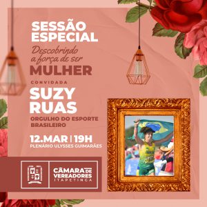 A atleta Suzy Ruas é uma das mulheres de destaque convidadas para palestrar na sessão especial da Câmara Municipal de Itapetinga que tem como tema “Descobrindo a força de ser mulher”. Proposto pela Mesa Diretora da Casa, o evento será realizado nesta quinta-feira (12), às 19 horas, no Plenário Ulysses Guimarães.