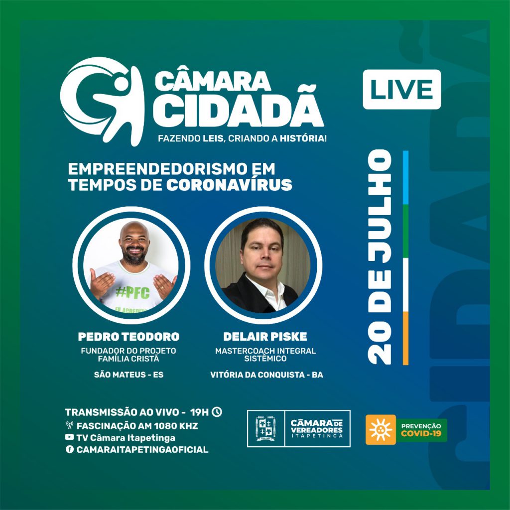 Nesta segunda-feira (20), às 19 horas, a Câmara Municipal de Itapetinga levará ao ar mais uma edição do projeto Câmara Cidadã. Desta vez, os convidados vão discutir o tema “Empreendedorismo em tempos de coronavírus”.