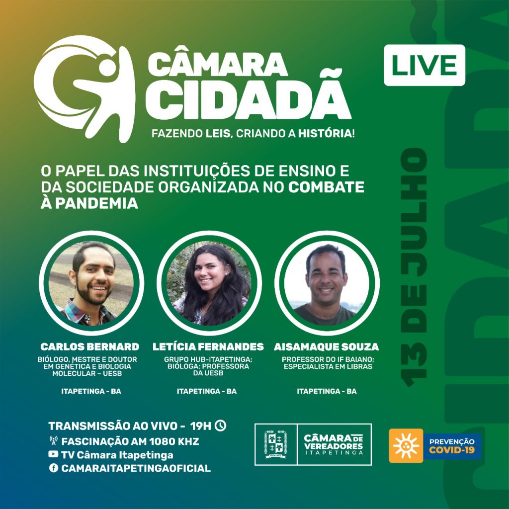 Na próxima segunda-feira (13), às 19 horas, a Câmara Municipal de Itapetinga vai realizar uma live sobre o papel das instituições de ensino e da sociedade organizada no combate à pandemia. O debate virtual contará com a participação dos professores Aisamaque Souza, Carlos Bernard e Letícia Fernandes, representando o Instituto Federal de Educação, Ciência e Tecnologia Baiano (IF Baiano), Universidade Estadual do Sudoeste da Bahia (Uesb) e grupo HUB-Itapetinga, respectivamente.