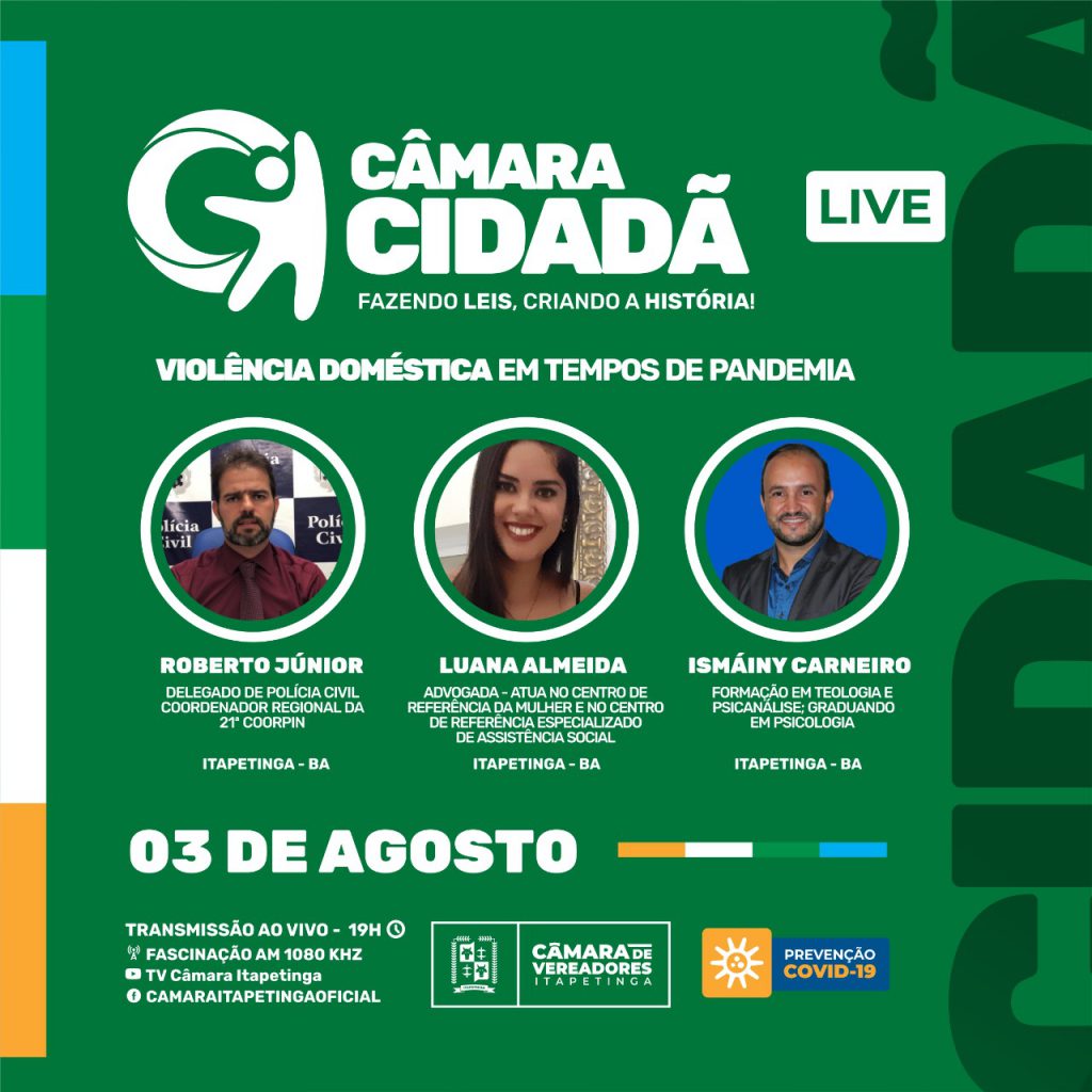Em sua sétima edição, a live da Câmara Cidadã vai discutir violência doméstica em tempos de pandemia. Promovido pela Câmara Municipal de Itapetinga, o encontro virtual vai ao ar na próxima segunda-feira (3), às 19 horas, com a participação do delegado Roberto Júnior, da advogada Luana Almeida e do psicanalista Ismáiny Carneiro.