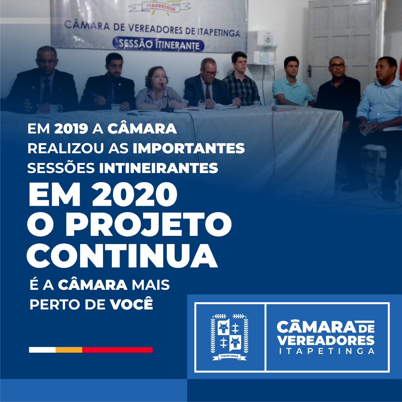No ano de 2019 a Câmara de Vereadores de Itapetinga realizou importantes Sessões Itinerantes nos bairros e nos Distritos como em Bandeira do Colônia e Palmares.  O compromisso da Presidente da Câmara Naara Lima Duarte junto a Mesa Diretora é de levar o Poder Legislativo cada vez mais próximo do cidadão, por isso em 2020 o projeto Sessão Itinerante continuará levando a excelência dos debates políticos e das revindicações  levantadas pelos cidadãos.
