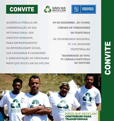 Em parceria com a Defensoria Pública do Estado da Bahia, a Câmara Municipal de Itapetinga vai realizar uma audiência pública em comemoração ao Dia Internacional dos Direitos Humanos, para enfrentamento da invisibilidade social dos catadores de reciclagem e apresentação do Programa Mãos que Reciclam da DPE/BA. O evento acontecerá nesta quinta-feira (9), às 19 horas, no Plenário Ulysses Guimarães.