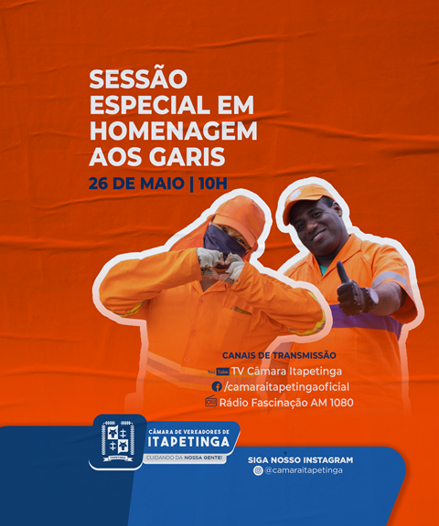 Por iniciativa do vereador Anderson da Nova (DEM), a Câmara Municipal de Itapetinga vai realizar uma sessão especial em homenagem aos profissionais da limpeza urbana, os garis. O evento acontecerá nesta quarta-feira (26), às 10 horas, no Plenário Ulysses Guimarães.