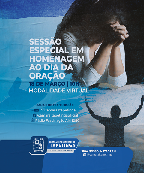 Por iniciativa do vereador Luciano Almeida (MDB), a Câmara Municipal de Itapetinga vai realizar uma sessão especial para celebrar o Dia Mundial da Oração, comemorado neste mês de março. O evento virtual acontecerá nesta quinta-feira (18), às 10 horas.