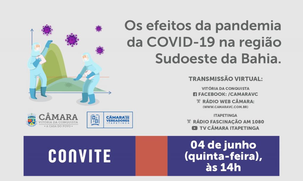 Nesta quinta-feira (04), as Câmaras de Vereadores de Vitória da Conquista e Itapetinga promovem juntas uma audiência pública sobre os efeitos da pandemia da Covid-19 na Região Sudoeste da Bahia.
