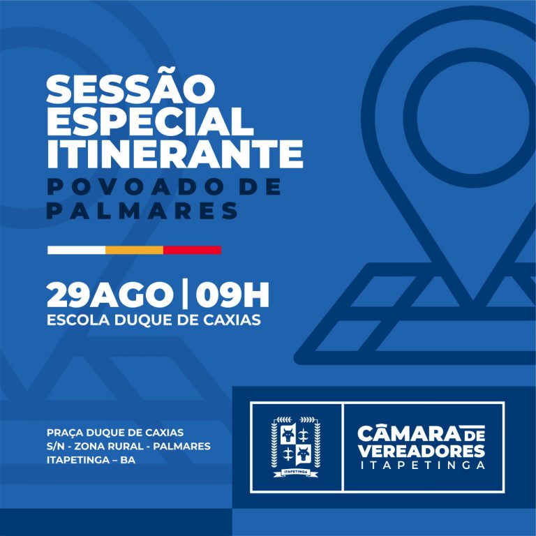 Por iniciativa da Mesa Diretora, a Câmara Municipal de Itapetinga vai realizar, nesta quinta-feira (29), uma sessão especial itinerante no povoado de Palmares. O evento